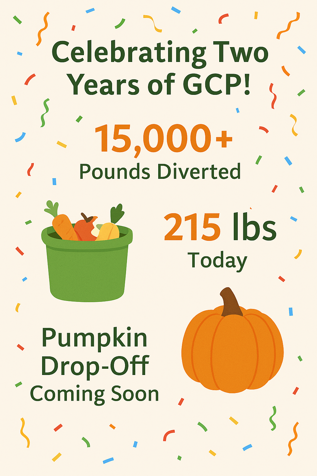 As your pumpkin displays start to wind down, don’t toss them in the trash. GCP will happily take your pumpkins (carved or not) and give them a second life in our compost pile. We’ll be leaving a large bin out next week just for pumpkin drop-off and will keep it out for a few weeks.Thank you to our amazing community for supporting GCP. Let’s keep composting, educating, and growing together!